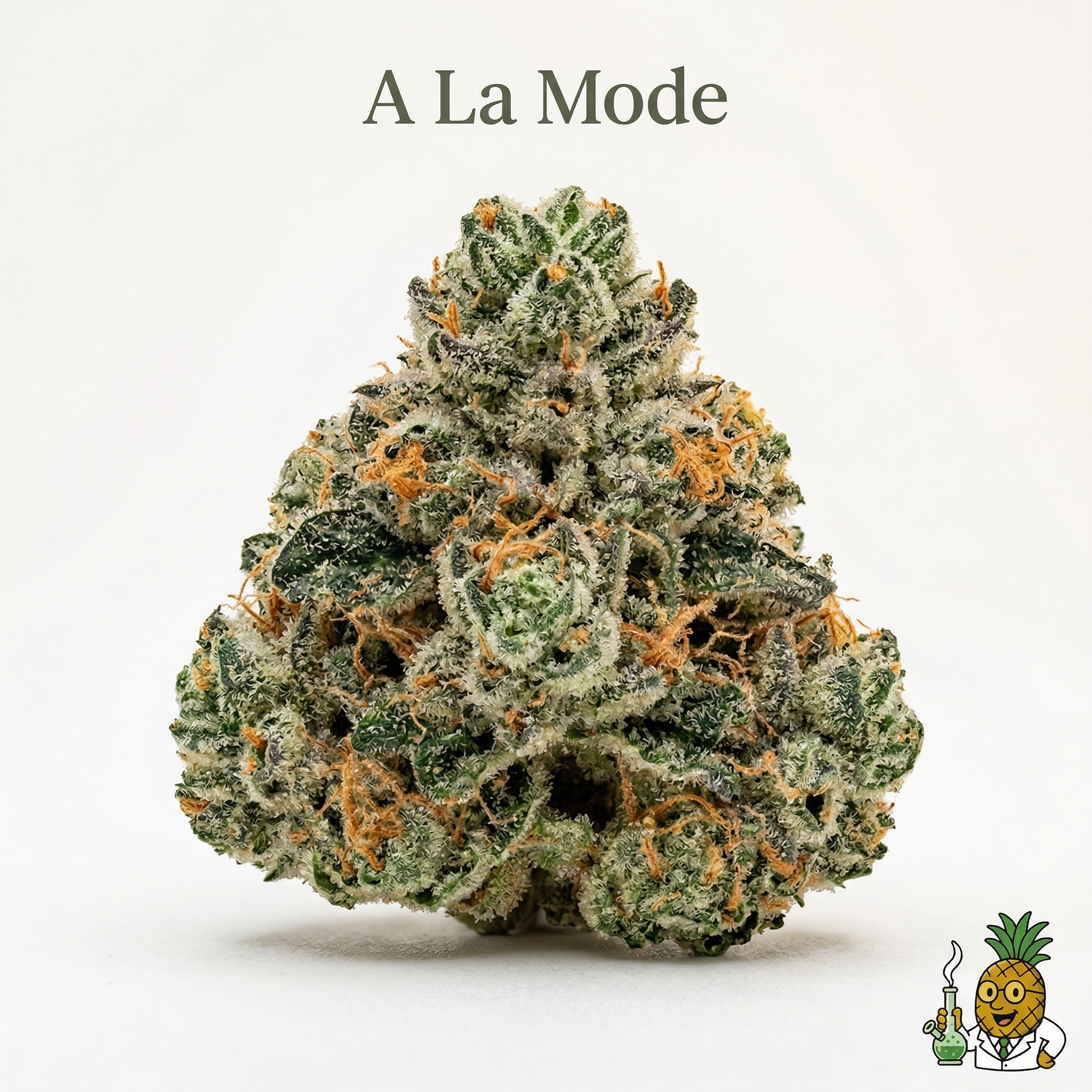A La Mode buds are visually striking — dense, medium-to-large forest green nuggets dusted with a generous coating of milky white trichomes that give them a frosted, almost icy appearance. You'll notice vivid orange pistils weaving through the green canvas, and some phenotypes display subtle purple undertones that deepen near harvest. The resin production is notably high, reflecting its Cookie lineage.
