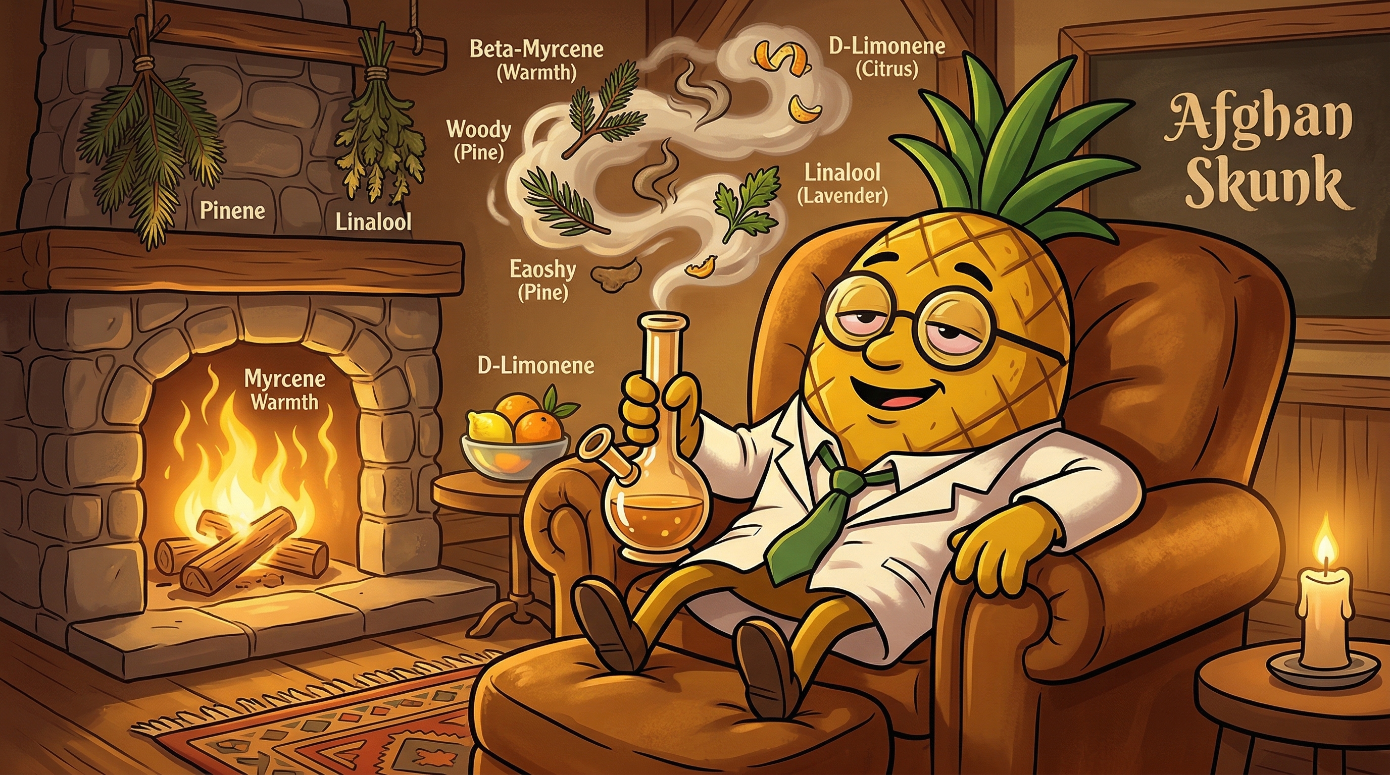 - Myrcene (~0.4%) — The dominant terpene, responsible for the strain's signature earthy, musky, herbal base. Myrcene is deeply sedating and amplifies the body-relaxing effects of THC through what researchers call the "entourage effect".