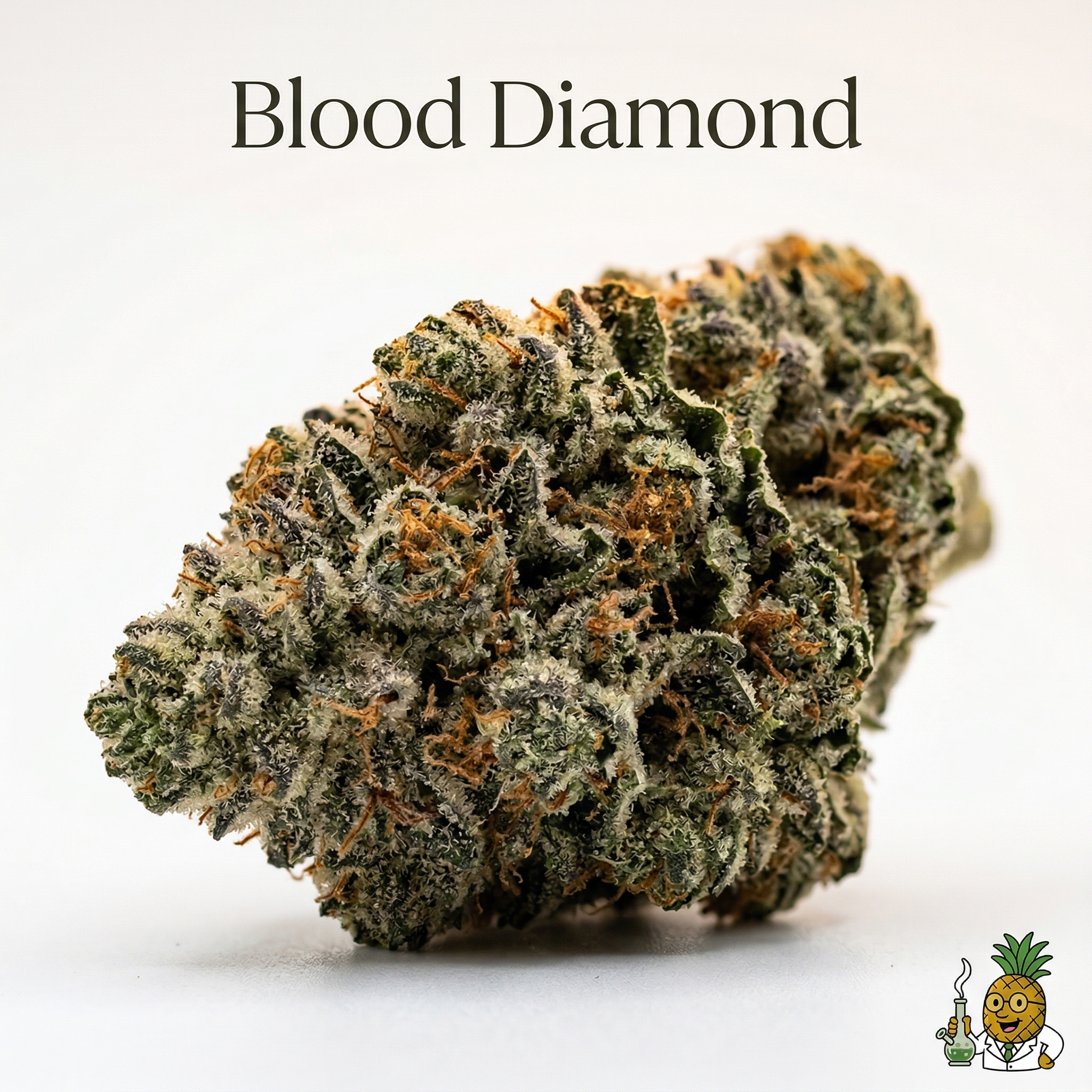 Blood Diamond buds are dense, compact, and heavily frosted — typical of its pure indica heritage. You'll notice deep forest greens with olive and sage undertones, occasionally touched by subtle purple hues in cooler conditions. Fiery orange pistils weave throughout, and a thick blanket of milky white trichomes gives buds a crystalline, jewel-like appearance — perhaps the origin of the "diamond" in its name.
