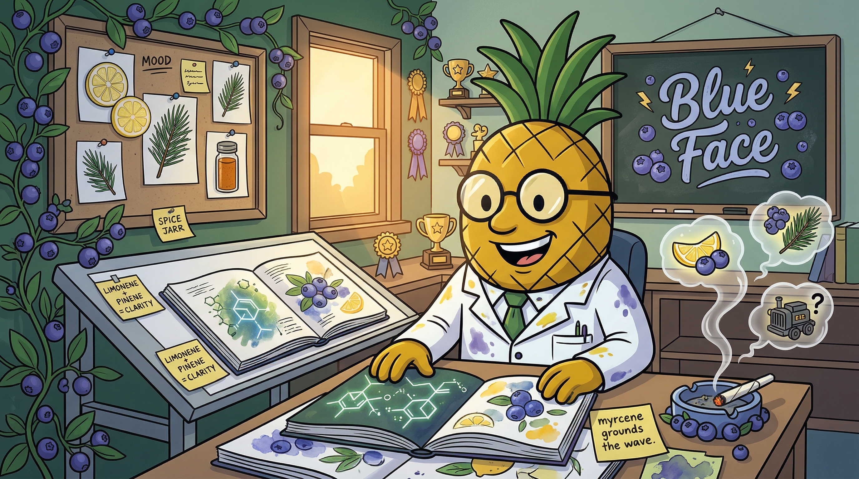 Blue Face delivers a fast-acting, cerebral onset that washes over you within minutes. You'll feel an immediate euphoric uplift — a bright, clean rush of mental energy that sharpens focus and sparks creativity. This is the limonene and pinene combination doing their work. As the experience deepens into the peak, a warm, relaxed body sensation begins to complement the mental clarity rather than overwhelm it. The myrcene and linalool ease muscle tension without putting you on the couch. The overall experience is energized but grounded — creative and focused without anxiety, relaxed but not sedated. Duration tends to run 2–3 hours for most users.