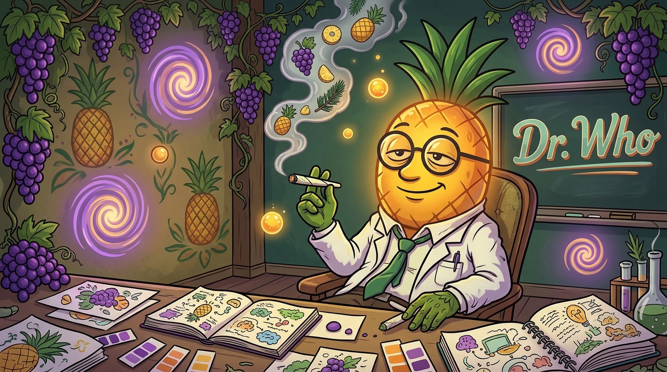 Okay so I just took a couple hits of Dr. Who and I need to talk about what's happening right now. The first thing I noticed was this warm pressure behind my eyes — not uncomfortable, actually really pleasant — like my brain just exhaled for the first time all day. Then this giddy, creative energy started bubbling up. Ideas are connecting in interesting ways. The Myrcene is doing its thing in my body — I can feel this gentle heaviness in my limbs, like gravity got turned up just a notch, but my mind is still completely here. That Pinene is keeping things sharp and clear. What's really remarkable about Dr. Who is this temporal quality — time feels slower, more deliberate, like each moment has more texture to it. The grape and citrus I tasted on the inhale left this lovely warm sweetness in the back of my throat. I feel genuinely happy — not artificially so, just authentically content. This is what a well-balanced hybrid should feel like. The body is handled, the mind is free.