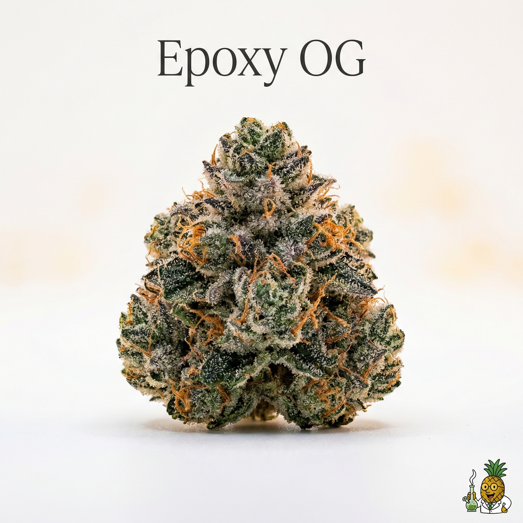 Epoxy OG produces dense, resinous buds that showcase its Gorilla Glue #4 heritage. Expect deep forest green flowers with purple undertones in cooler-grown phenotypes. The buds are generously coated with amber and milky-white trichomes, creating a frosty appearance that justifies the "Epoxy" name. Bright orange to rust-colored pistils weave through the bud structure, creating striking visual contrast. The overall appearance is sticky and heavily resinous, often requiring a grinder to properly break apart.