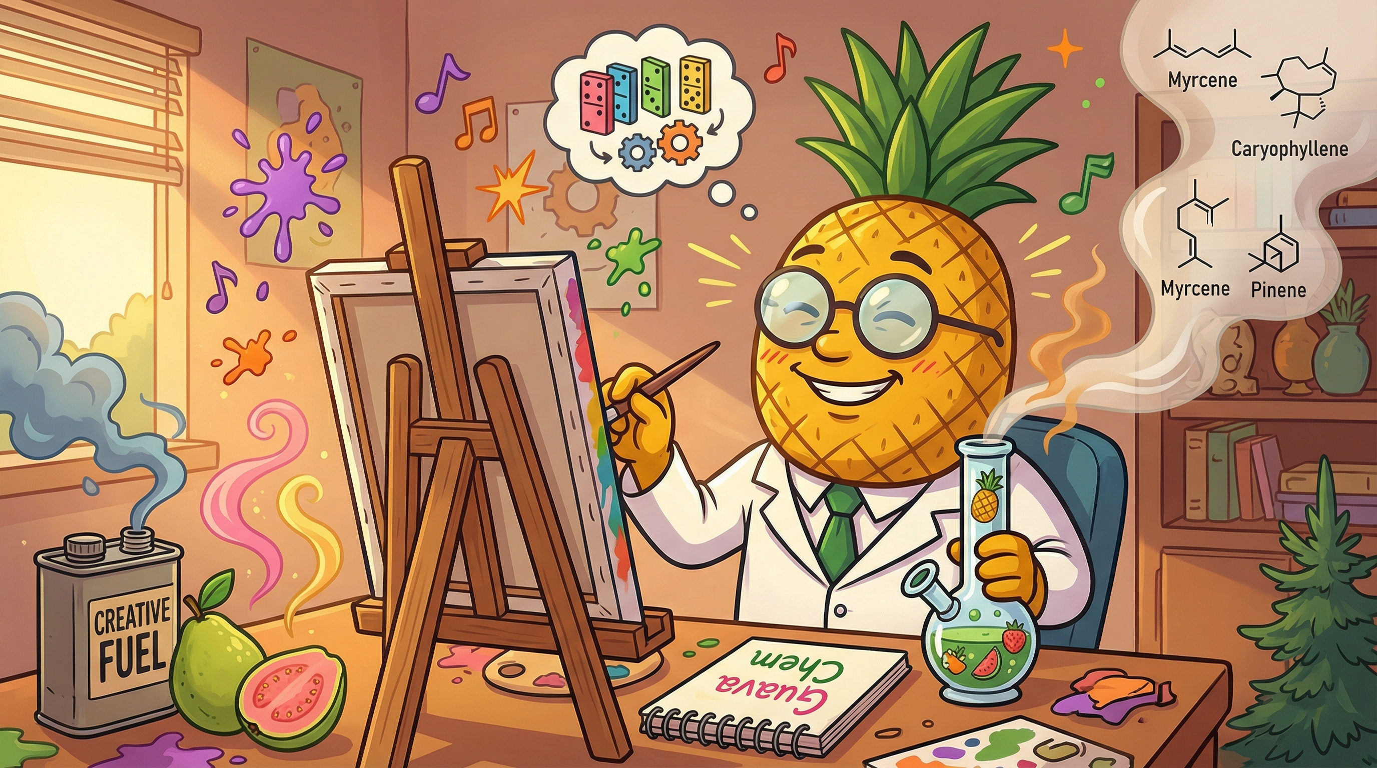Okay, so this is interesting... The Guava Chem experience hits like a two-stage rocket launch. First comes this crystalline mental clarity—my thoughts aren't scattered, they're organized but playful, like watching dominoes fall in fascinating patterns. I can feel the pinene sharpening my focus while the limonene adds this subtle brightness to everything. It's not racy or anxious; it's more like someone turned up the contrast and saturation on my perception.