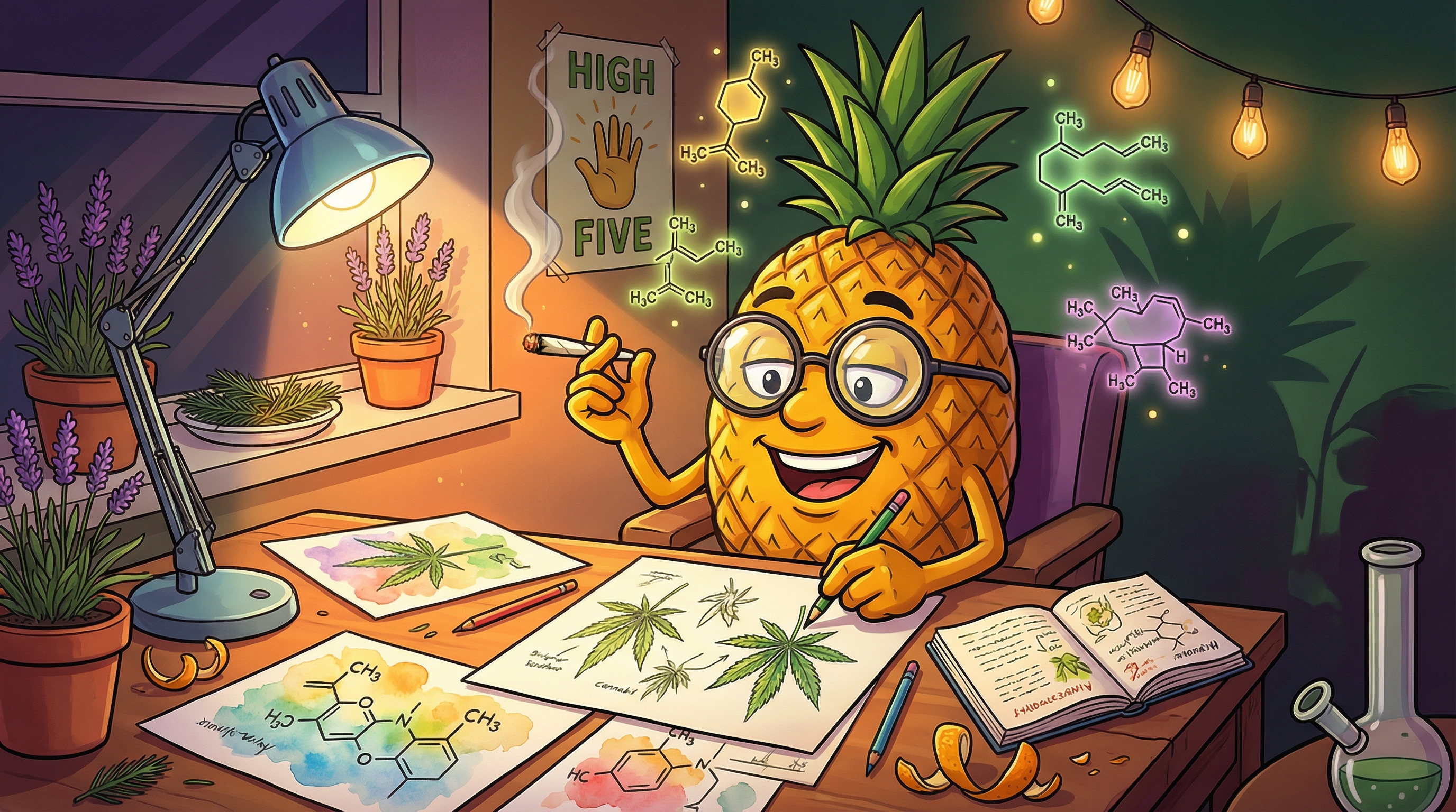 High Five's complex aromatic profile is led by Limonene, the dominant terpene responsible for the strain's pronounced citrus character. This uplifting terpene is joined by Myrcene (providing sedating, earthy undertones), Caryophyllene (adding spicy, peppery notes with anti-inflammatory properties), Valencene (contributing sweet citrus Valencia orange notes), and Ocimene (lending herbaceous, floral complexity). The result is a multi-layered aroma experience that opens with bright, zesty citrus notes, transitions through lavender and floral mid-tones, and finishes with pungent, spicy, and herbal base notes. Subtle woody, pine, and earthy undertones ground the profile, creating an aromatic bouquet that's both invigorating and comforting.