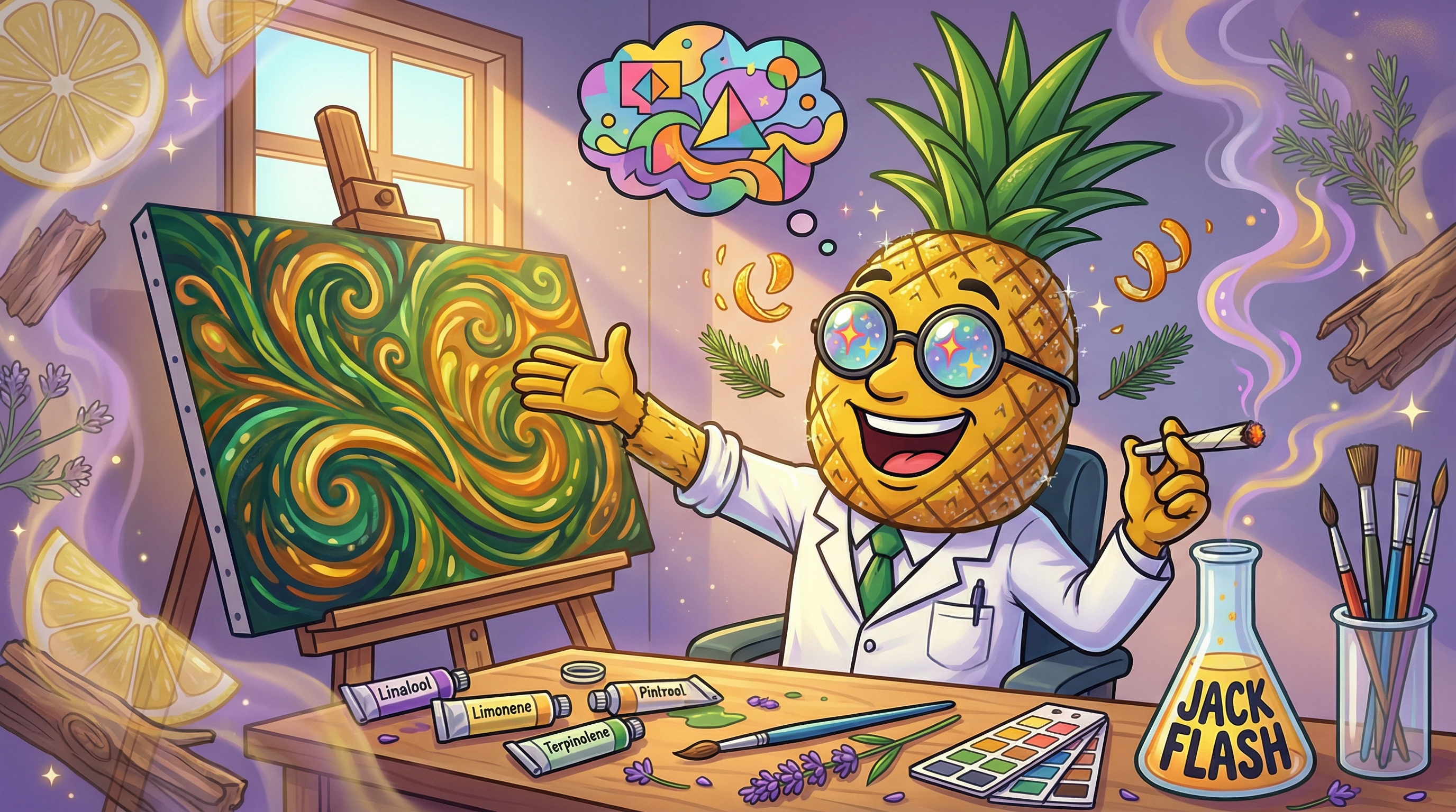 Jack Flash boasts an impressive total terpene content of 11.13%, with a complex profile dominated by linalool (4.55%), limonene (2.17%), terpinolene (1.23%), and beta-caryophyllene (1%). This terpene combination creates a multidimensional aromatic experience that begins with bright citrus notes—think fresh lemon zest and orange peel—layered over an earthy, skunky foundation inherited from its Super Skunk parentage. The high linalool content contributes floral undertones reminiscent of lavender, while terpinolene adds piney freshness and subtle herbal spice. As you break apart the buds, you'll notice pungent, dank aromas that intensify with handling, revealing sweet tropical fruit hints and a distinctive incense-like quality. The limonene provides mood-elevating properties, while caryophyllene offers potential anti-inflammatory benefits through CB2 receptor interaction.