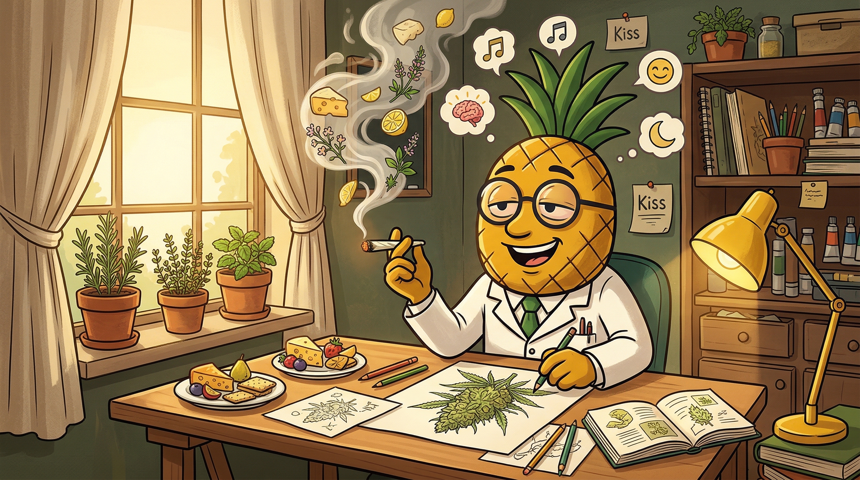 Okay so I just sparked some Kiss and — wow — the cheese aroma alone is worth the price of admission. Within minutes there's this gentle warmth spreading across my temples, like a kind hand placing itself on my shoulders and saying relax, it's handled. My thoughts are moving fluidly — I feel creatively activated without any of that anxious over-stimulation. Ideas are connecting in interesting ways. The limonene is doing its thing: there's a bright, almost citrusy optimism underneath the high that feels genuinely mood-lifting.