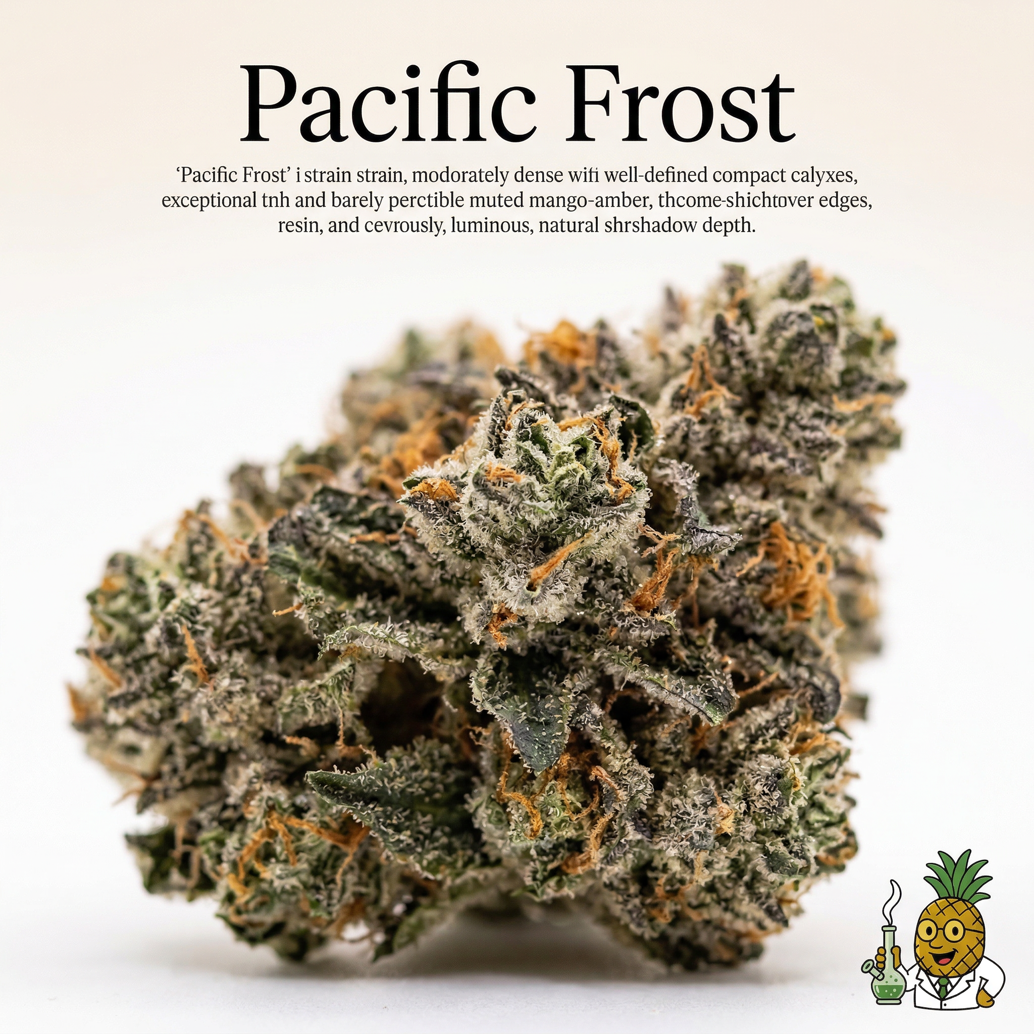 Pacific Frost is an indica-dominant hybrid cross between Pacific OG and Frosty, originating from California breeding lines with West Coast OG/Kush and Frost/White-style resin lineage.