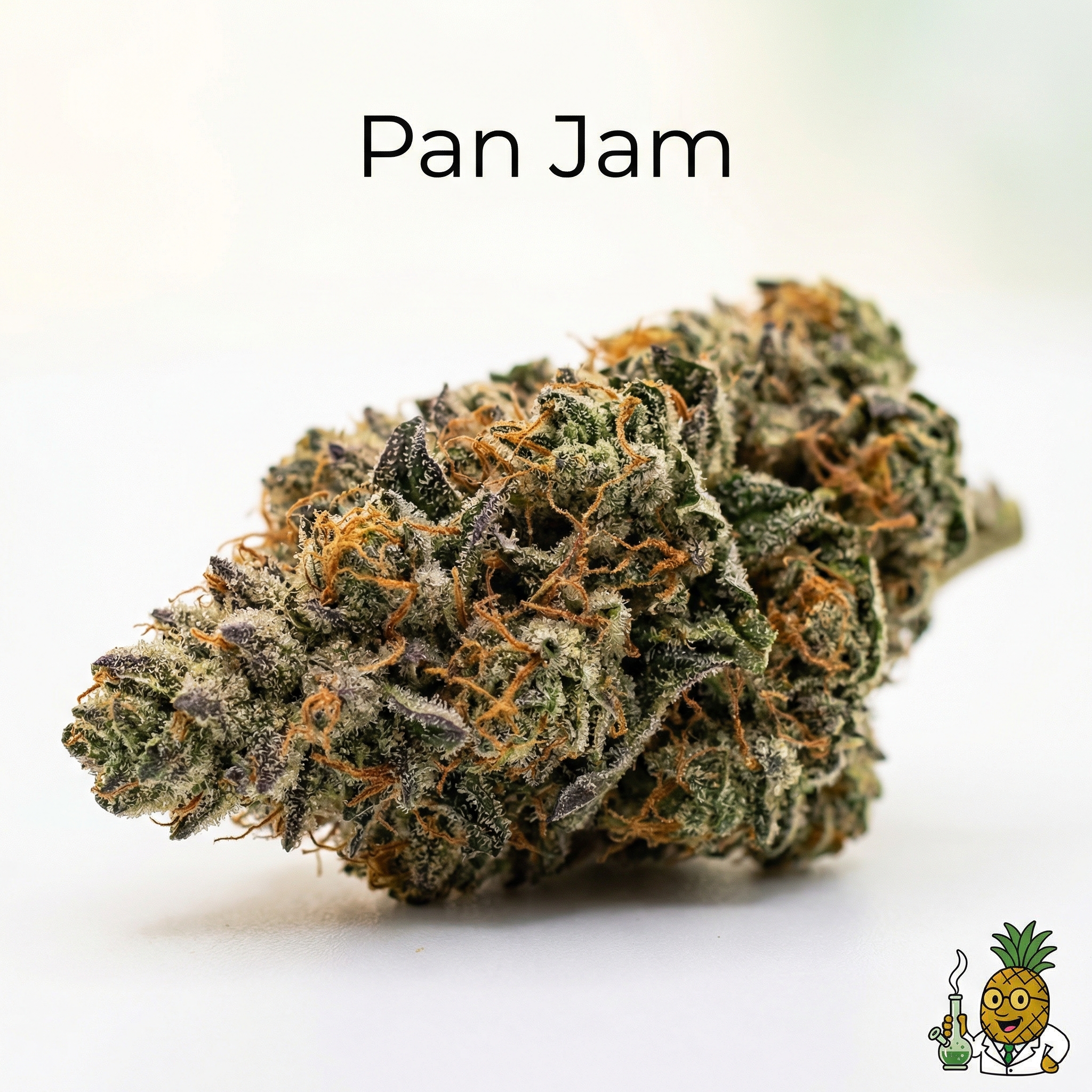 Pan Jam buds display the classic sativa structure—moderately dense with an elongated, spear-like shape. Expect deep forest green and olive tones as primary colors, often accented by purple undertones that emerge during cooler growing conditions. The buds showcase abundant fiery orange to rust-colored pistils that curl and twist throughout the flower structure. Trichome coverage is high, giving the buds a frosty, crystalline appearance that speaks to their potency. The overall visual presentation is striking—colorful, resinous, and unmistakably premium.