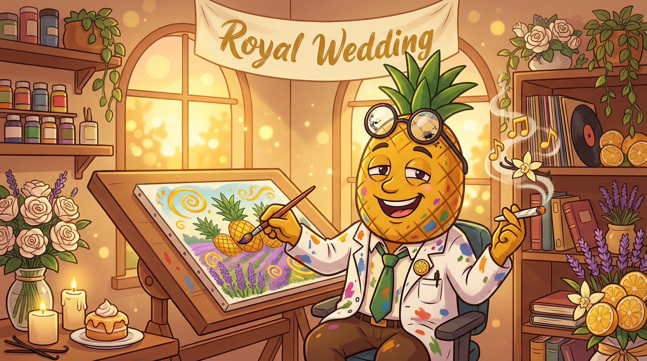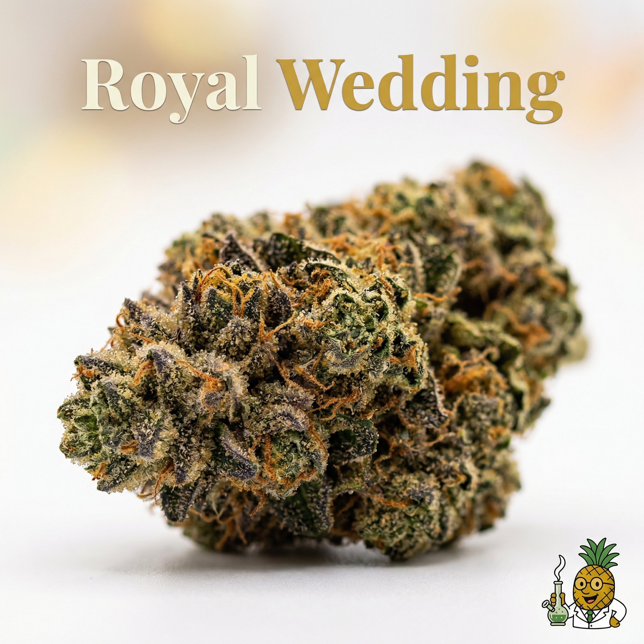Royal Wedding (aka Royal Wedding Cake) is a regal 70/30 indica-dominant hybrid bred by Rev Genetics from 4 Kings × Wedding Crasher #41. Expect a sweet, cakey, vanilla-citrus flavor profile and a beautifully balanced high — euphoric uplift gives way to deep body relaxation. With THC reaching up to 27%, it's a sophisticated evening companion for stress relief, creativity, and restful sleep.
