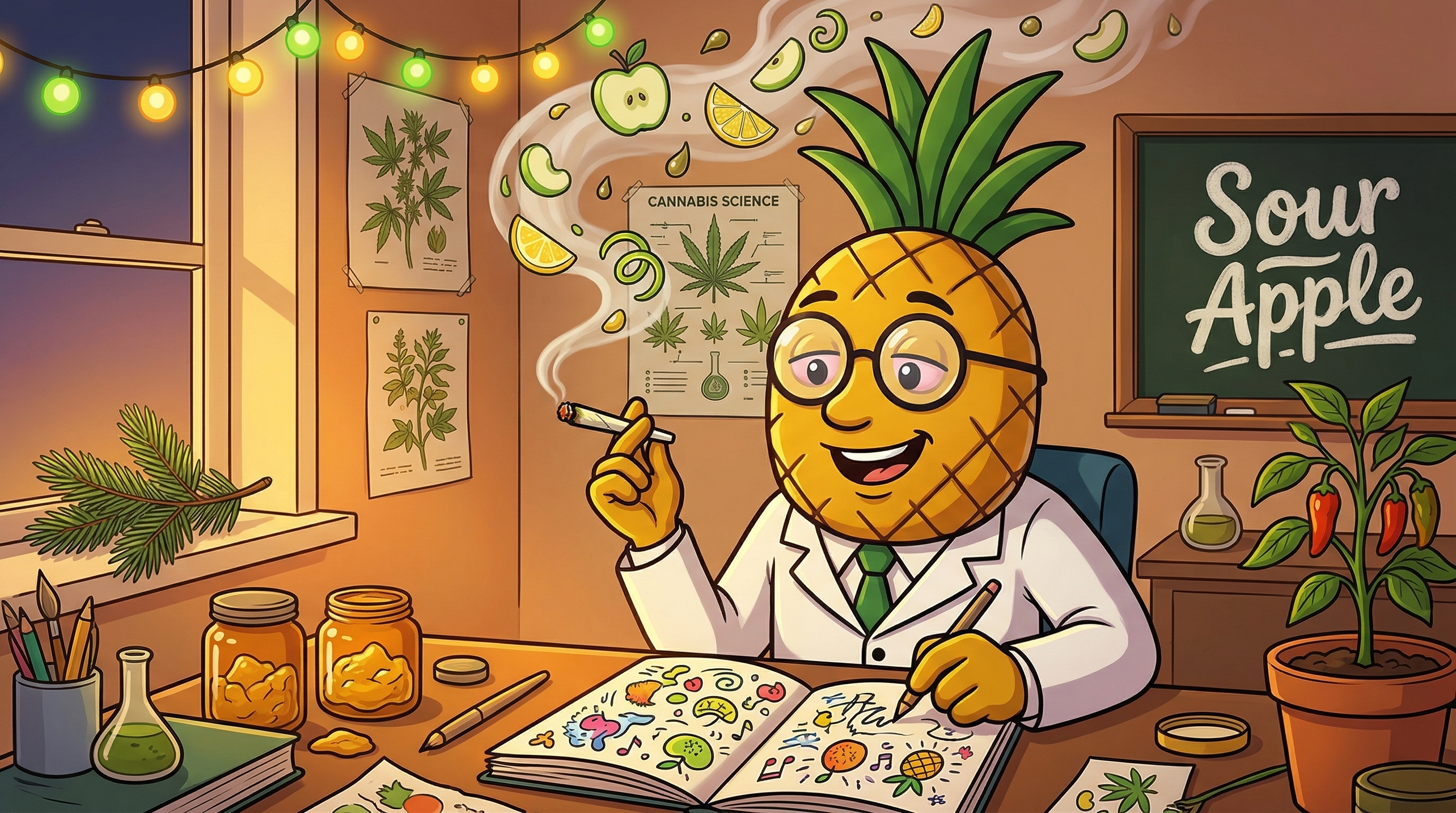 Okay so I just took a solid hit of Sour Apple and I need to tell you what's happening right now because it's genuinely interesting. The onset was fast — like, measurably fast. Within about five minutes there was this distinct cerebral brightening, like someone turned up the saturation on my thoughts. Ideas feel more interesting than they did before, which tracks with the limonene doing its mood-lifting thing up in the limbic system.