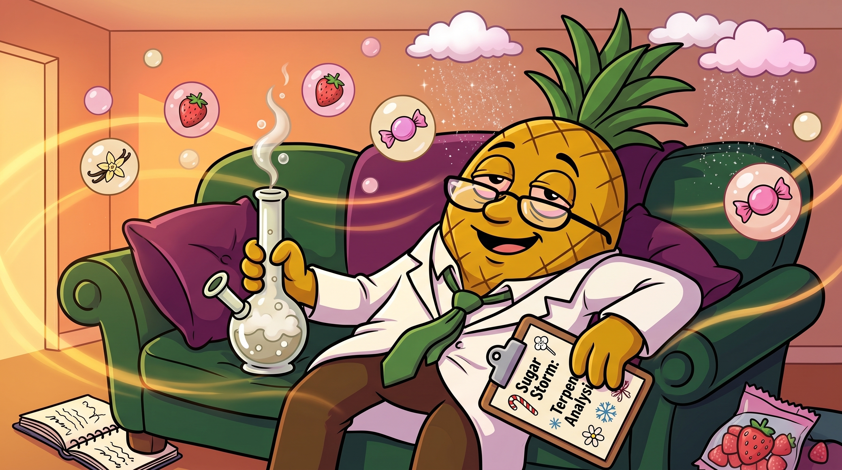 The flavor memory is still on my palate — that strawberry-vanilla-bubblegum complexity is genuinely impressive. This strain is both scientifically interesting and deeply enjoyable. I should probably stop typing now because my couch is calling my name very loudly.