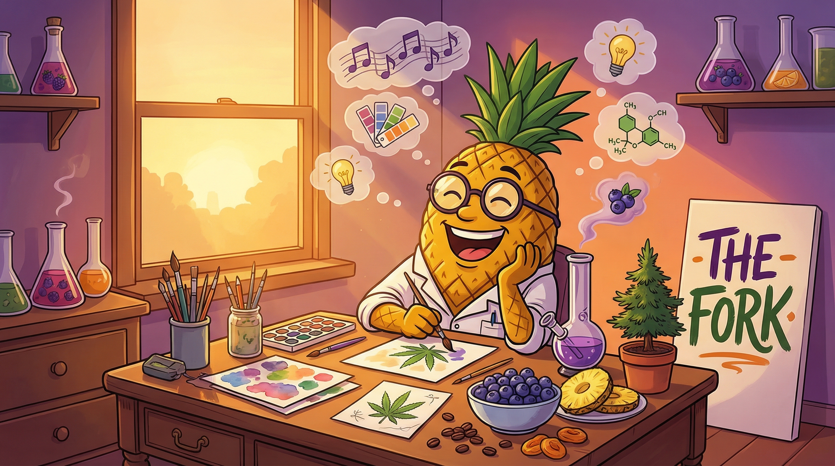 The Fork is a potent indica-dominant hybrid (70/30) from Colorado Seed Inc., featuring impressive genetics from DJ Short Blueberry, Dutch Treat, and potentially Hawaiian, Train Wreck, and Purple Urkle. With 20-27% THC and a myrcene-dominant terpene profile balanced by limonene and caryophyllene, this strain delivers euphoric creativity and giggly social energy that transitions into deep physical relaxation. The complex flavor profile combines sweet berries, tropical pineapple, nutty earthiness, and coffee undertones, while effects provide versatile relief for anxiety, depression, stress, and pain without excessive sedation.