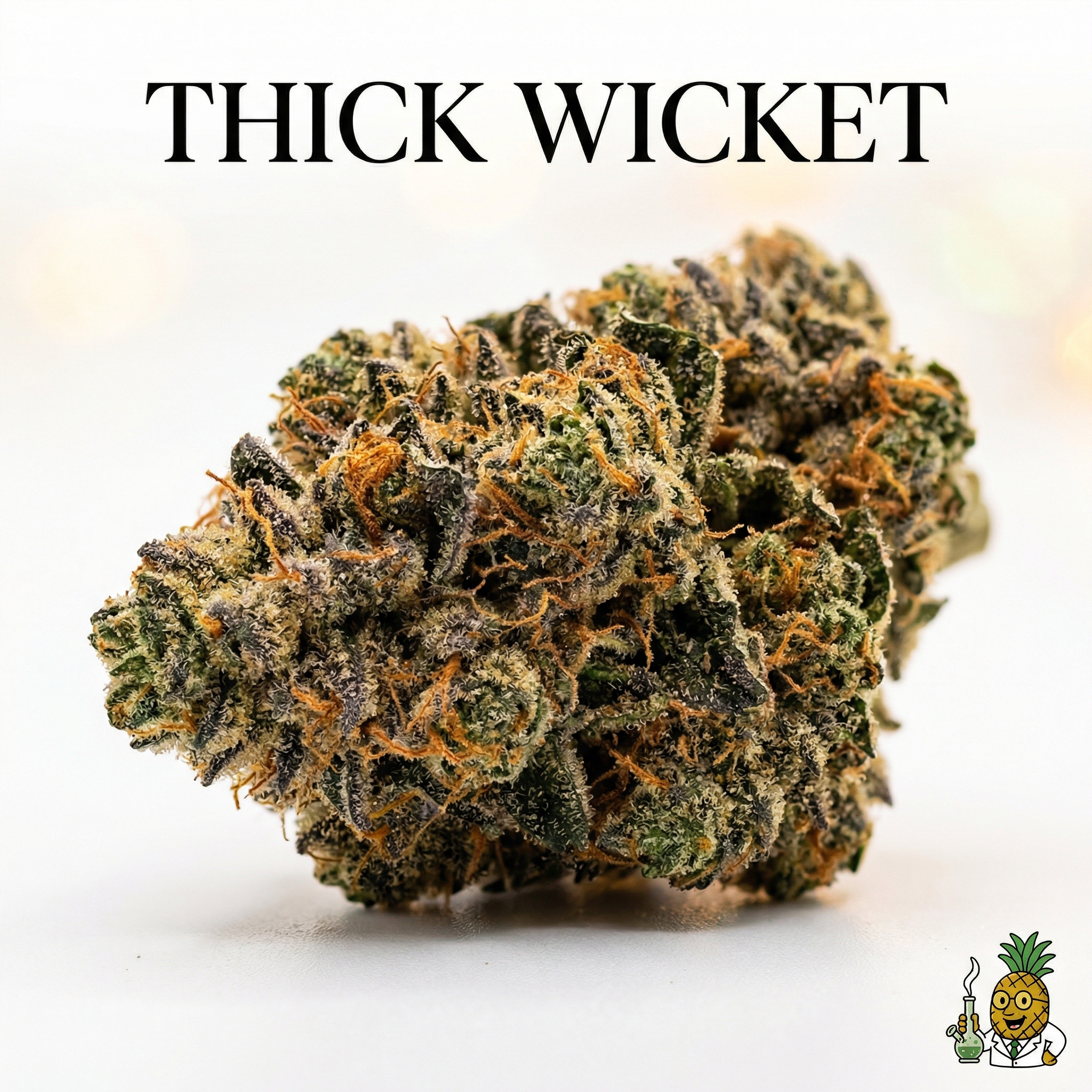 Thick Wicket is a hybrid strain with multiple reported lineages across sources, most commonly cited as OG Kush x Chemdog or White Widow x South Indian cross.