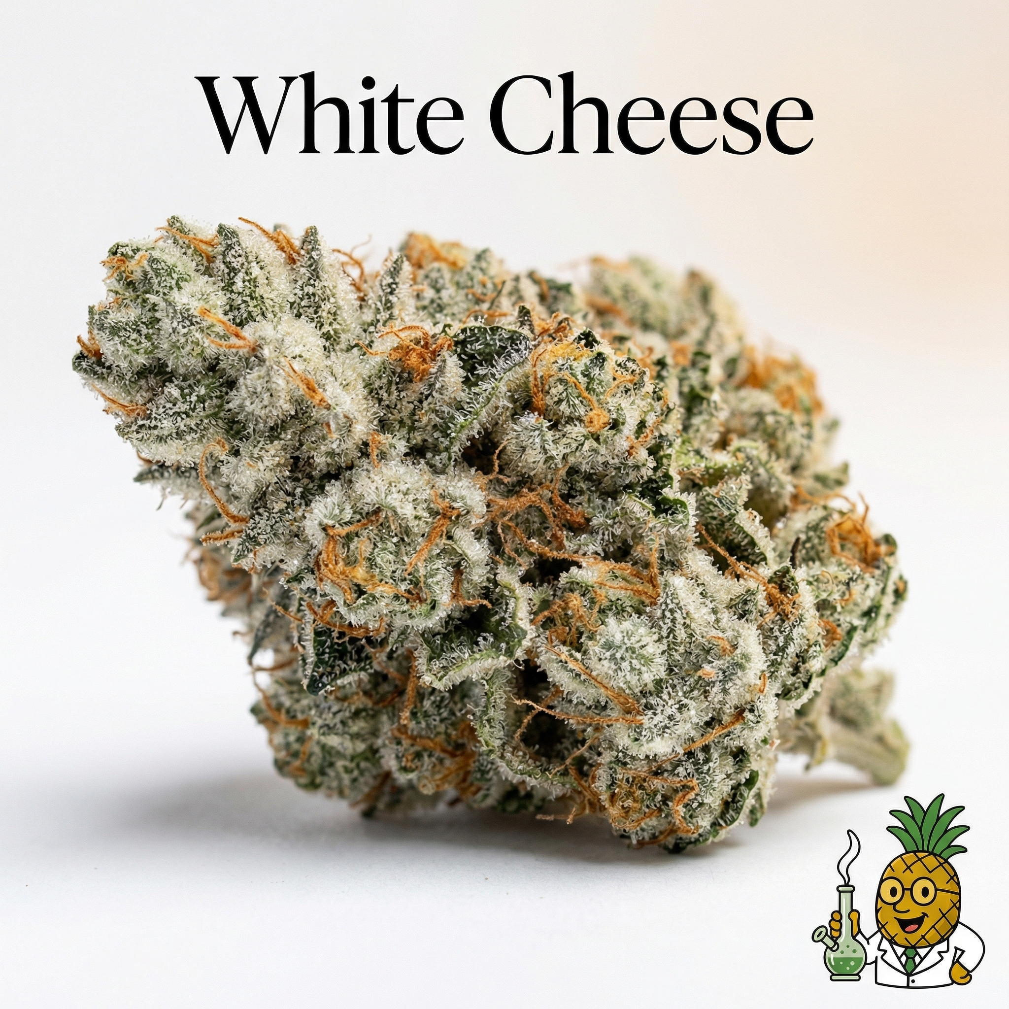 White Cheese is an indica-dominant hybrid strain created by crossing Cheese genetics with White Widow and Super Skunk lines. Multiple genetic lineages exist including crosses with White Rhino and Skunk #1, as well as Afghani-based variations.