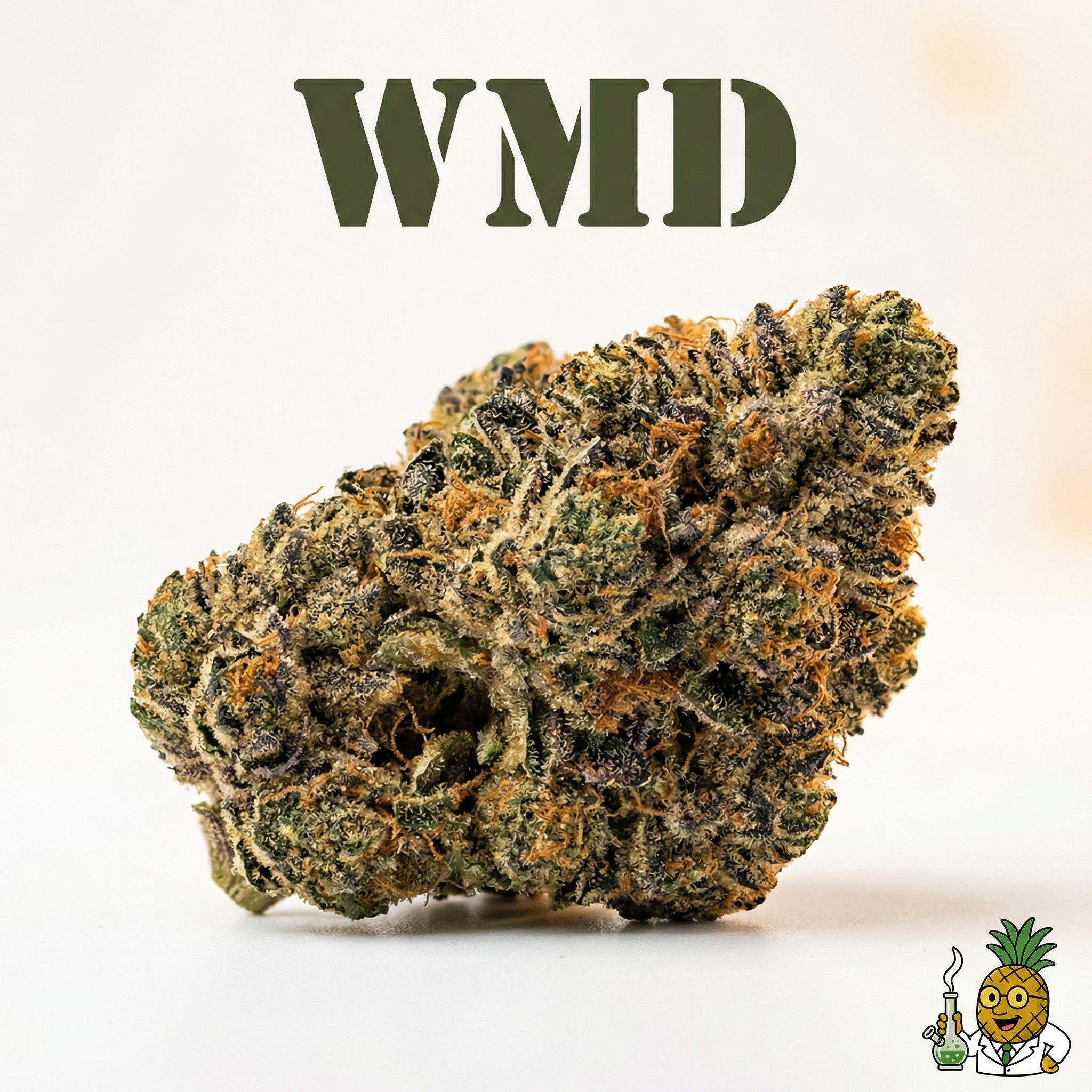 WMD is an indica-dominant hybrid strain bred from Big Bud and Fucking Incredible genetics, with some sources reporting alternative lineages from Northern Lights and Shiva Skunk or G13 Haze and White Widow.
