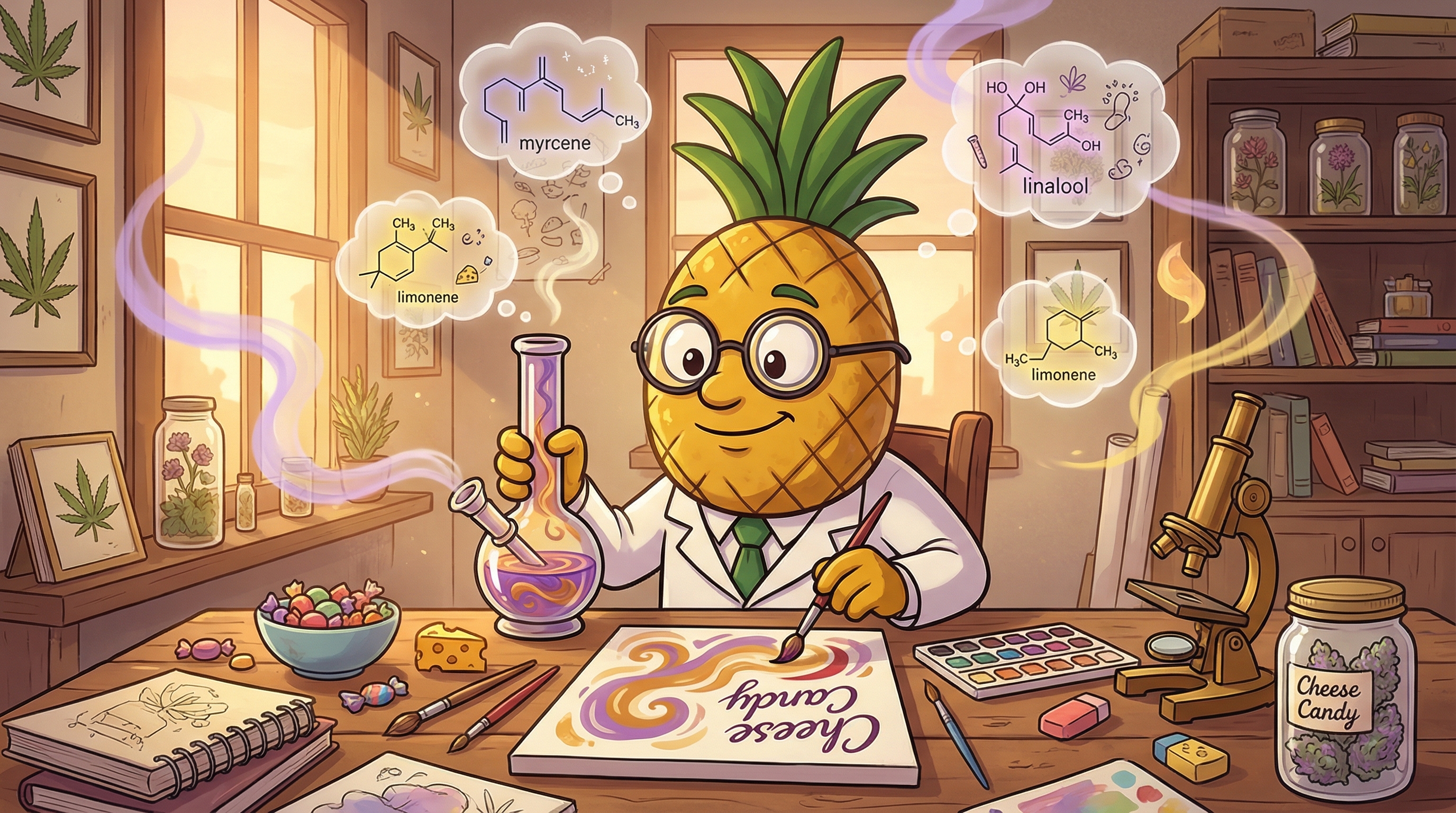 Cheese Candy's terpene profile is remarkably complex, with a total terpene content averaging 3.54%—significantly higher than many commercial strains. Myrcene dominates at 0.73%, providing earthy, sedating qualities that anchor the experience. Linalool follows at 0.66%, contributing floral lavender notes and calming properties. Limonene (0.51%) adds bright citrus uplift, while Ocimene and Terpinolene (both 0.41%) bring herbal and sweet dimensions. Beta-caryophyllene (0.32%) provides spicy, peppery notes with anti-inflammatory potential, while Pinene (0.20%) offers mental clarity and alertness.