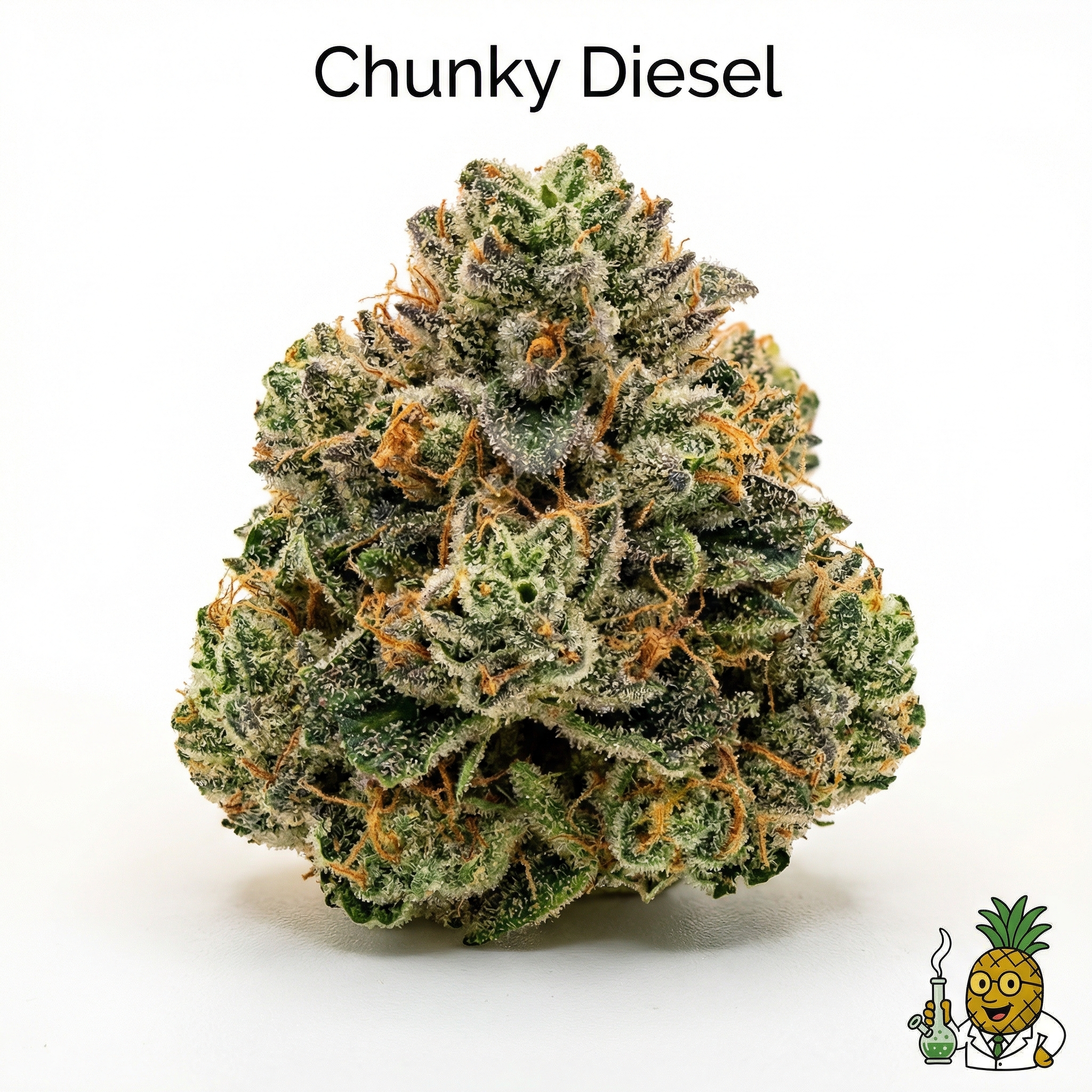 Chunky Diesel buds display chunky, dense structures true to their name. Expect deep forest green coloration with occasional purple undertones depending on growing conditions. Bright orange pistils weave throughout the bud surface, contrasting beautifully against the green backdrop. Heavy trichome coverage creates a frosty, crystalline appearance that signals potency, with amber and milky white trichomes glistening under light. The buds feel sticky and resinous when handled.