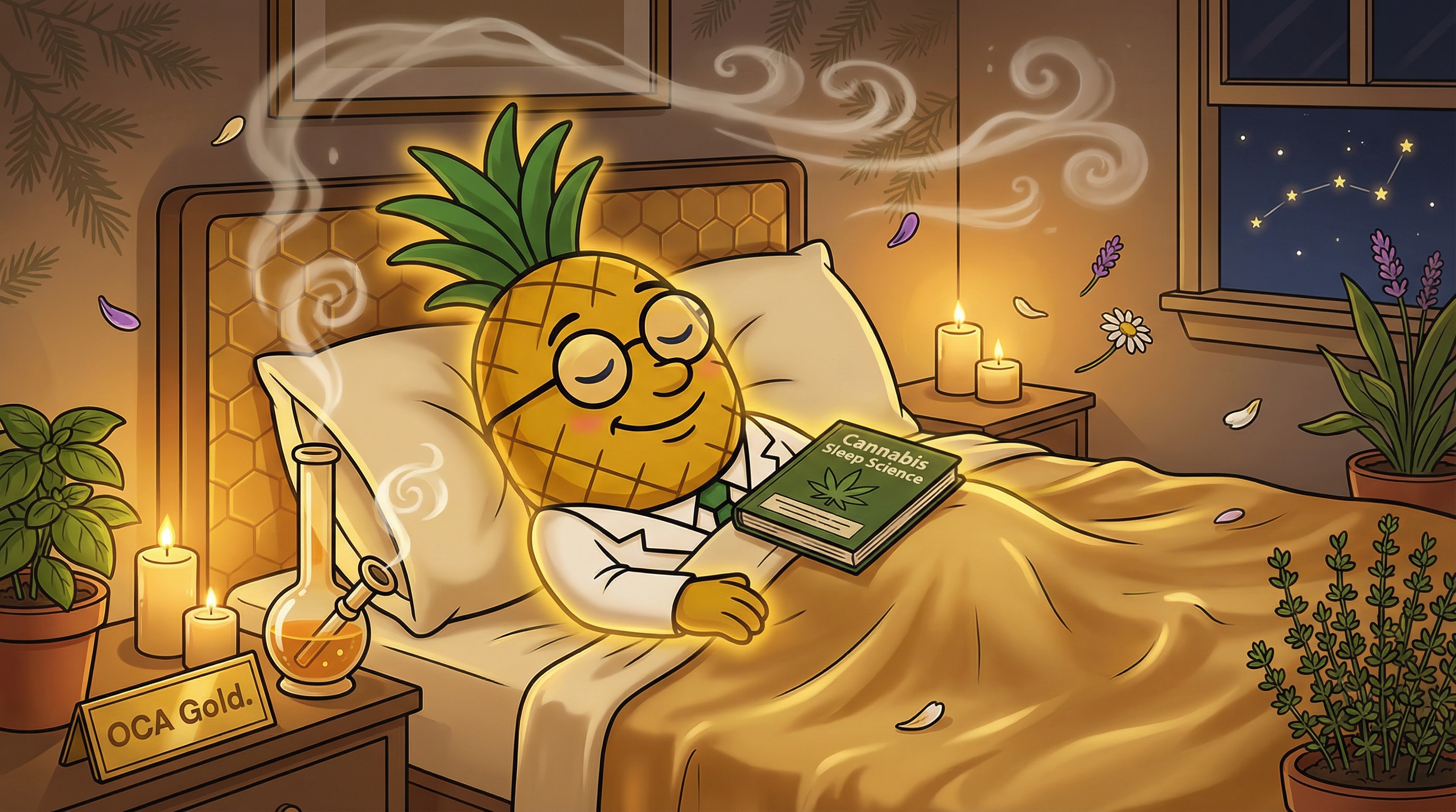 OCA Gold is a powerful 70/30 indica-dominant hybrid bred by Oregon Cannabis Authority from Afghani and Hindu Kush genetics. With 10-20% THC and a myrcene-dominant terpene profile featuring sweet honey, vanilla, and floral aromas, this strain delivers deeply sedating effects perfect for nighttime relaxation. Expect profound body relaxation, sleepiness, and euphoric calm that make OCA Gold ideal for combating insomnia, stress, and physical discomfort. The experience unfolds as gentle mental uplift followed by couch-locking physical sedation and restful sleep.