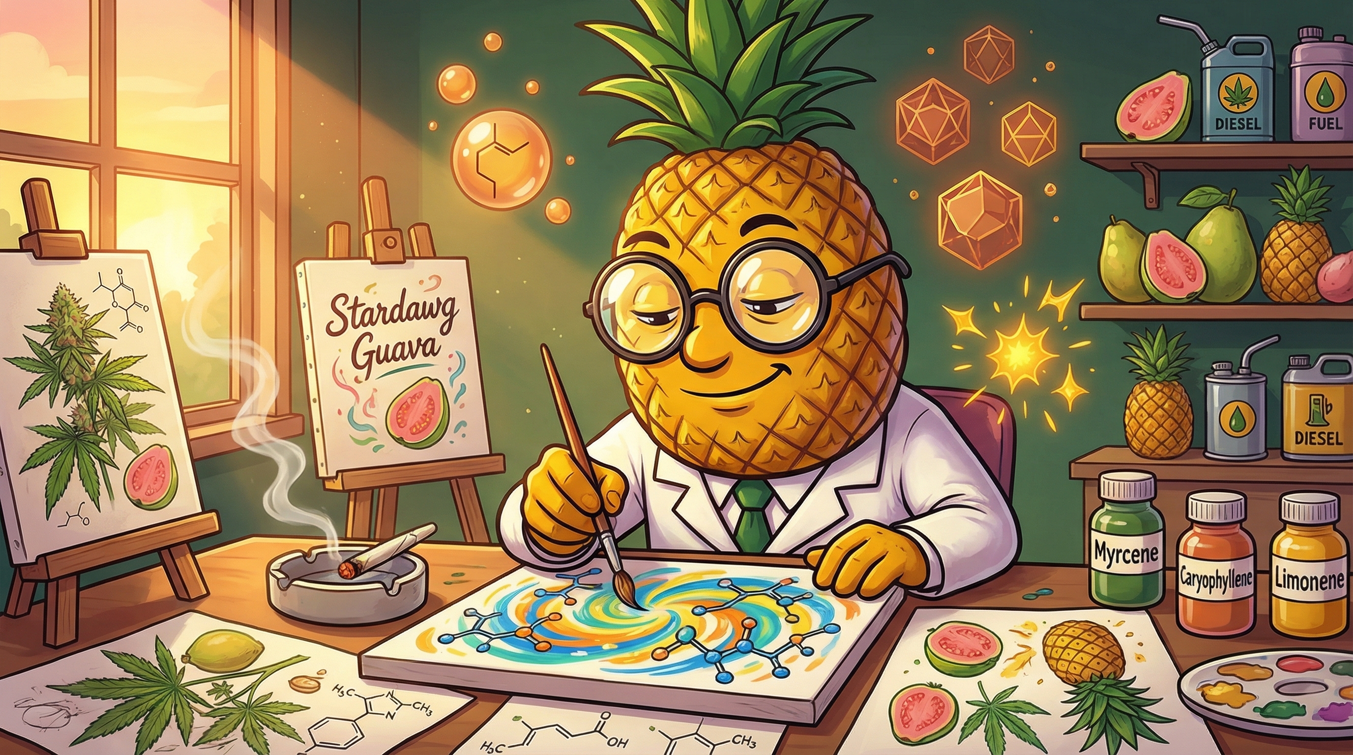 Stardawg Guava is a sativa-dominant hybrid (60/40) that won 1st Place at the 2012 Denver Cannabis Cup for Best Sativa. With 18-26% THC and a unique terpene profile dominated by myrcene, caryophyllene, and limonene, this strain delivers uplifting cerebral effects paired with tropical guava flavors and sharp chemical-diesel notes. Perfect for creative work, social activities, and focus-intensive tasks, it offers energizing euphoria with balanced body relaxation.