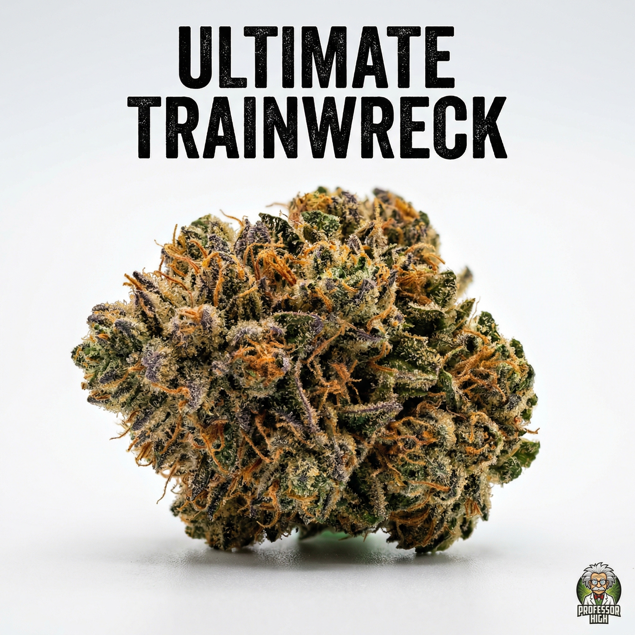 Ultimate Trainwreck is a hybrid strain with complex lineage including Trainwreck and Afghani as primary parents, with some sources indicating Mexican Sativa, North American Indica, or OG Kush heritage.